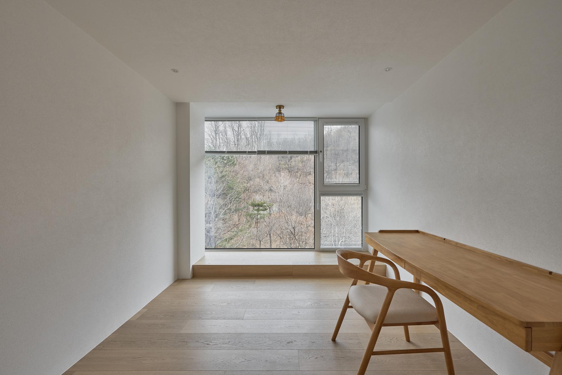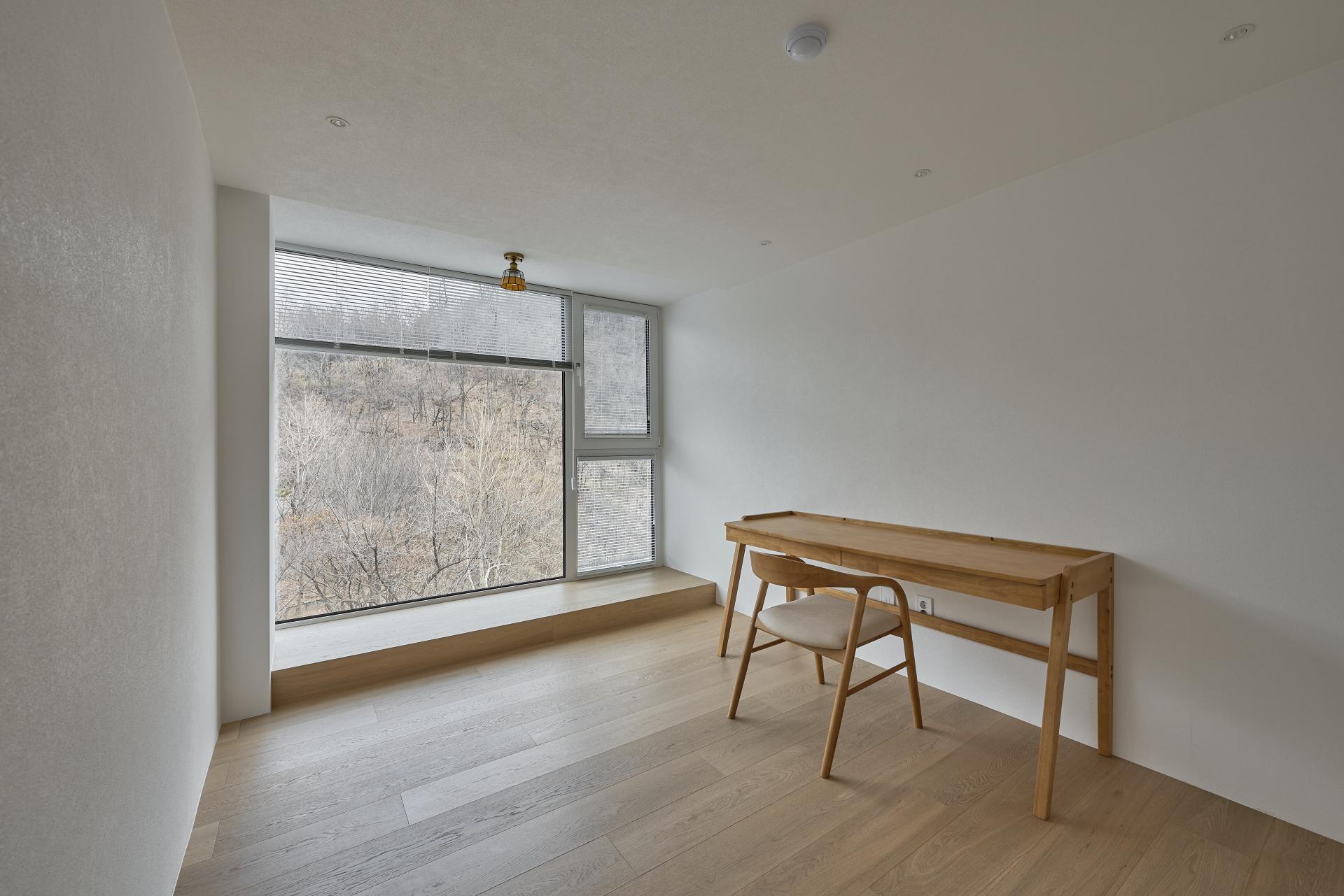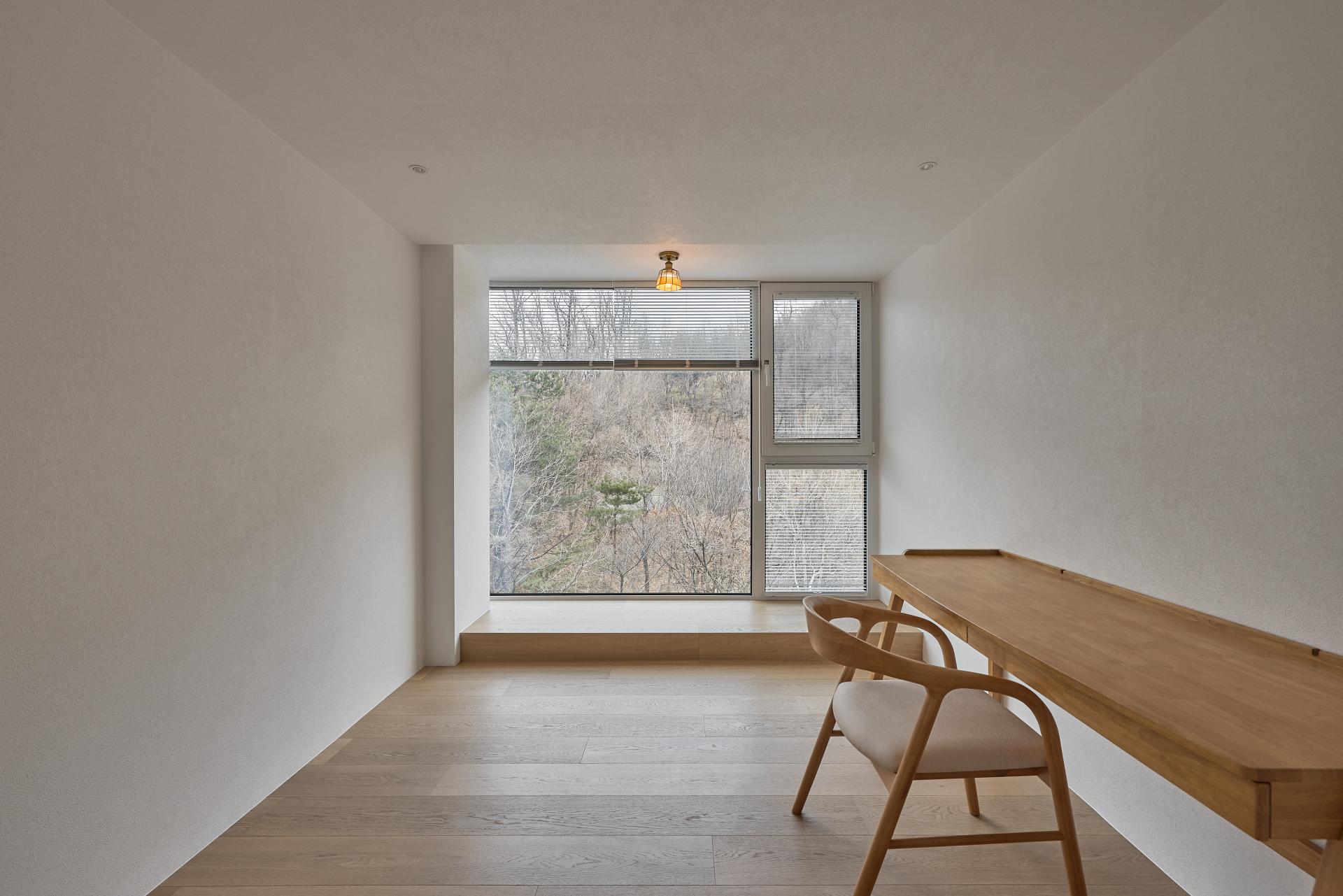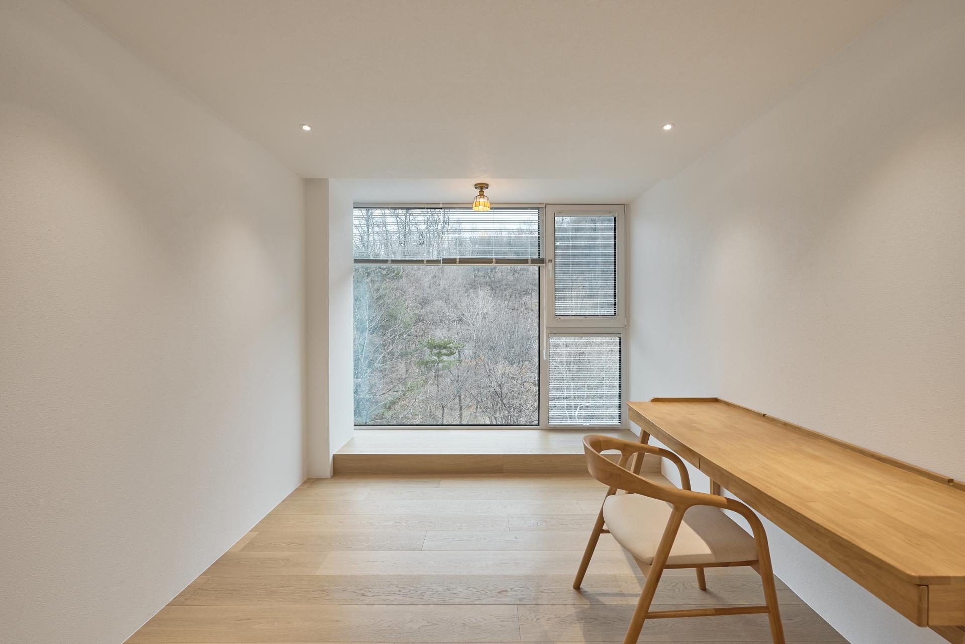 서재방의 산뷰를 살리기 위해 윈도우 시트 작업도 하여 아늑한 전원주택 무드를 연출했습니다.